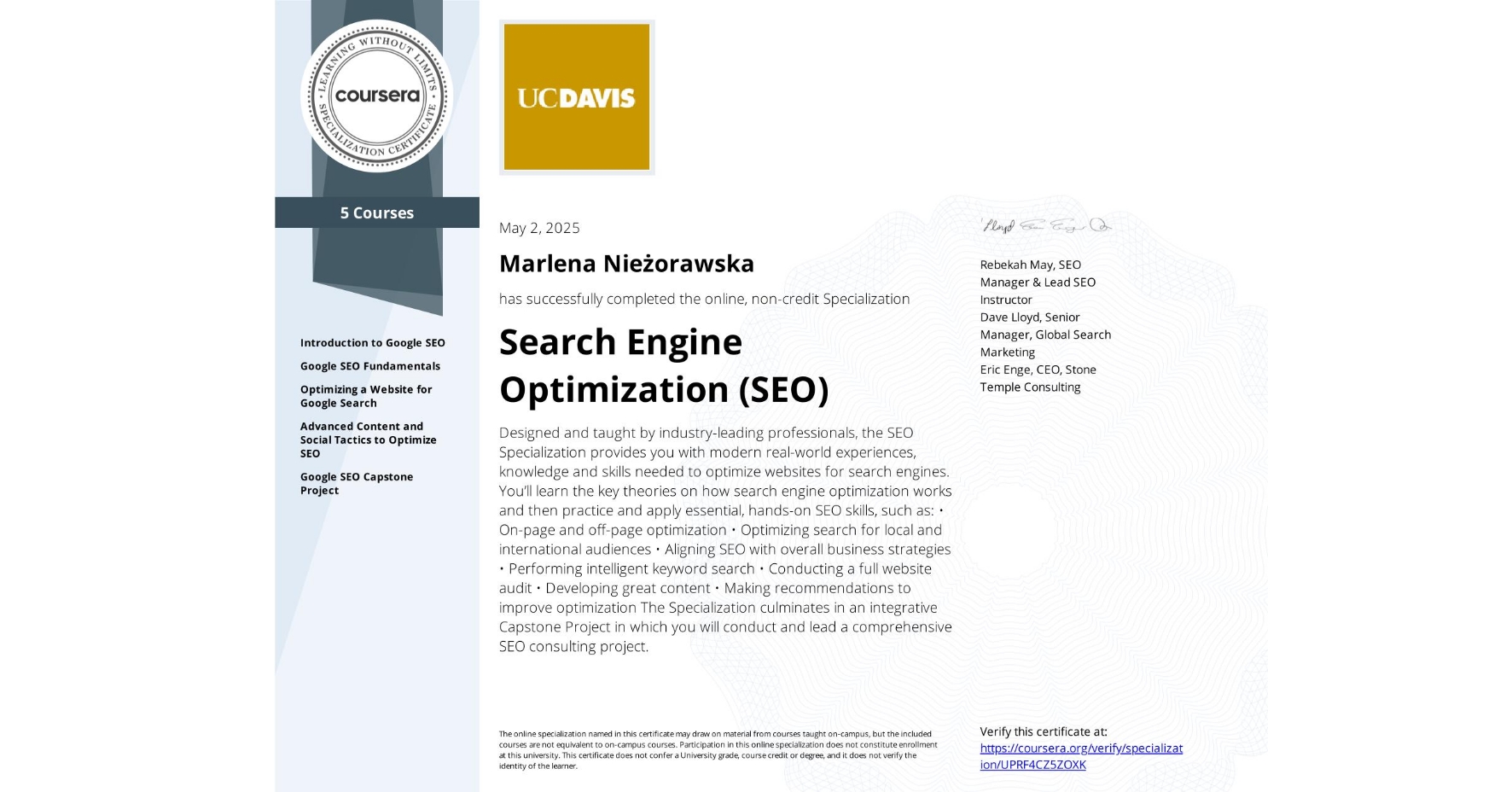 Certyfikat potwierdza moją biegłość w wykorzystaniu generatywnej AI do tworzenia skutecznych treści, analiz i automatyzacji działań marketingowych. Firmy współpracujące ze mną zyskują nowoczesne, szybkie i skalowalne procesy marketingowe, które realnie zwiększają efektywność i obniżają koszty.